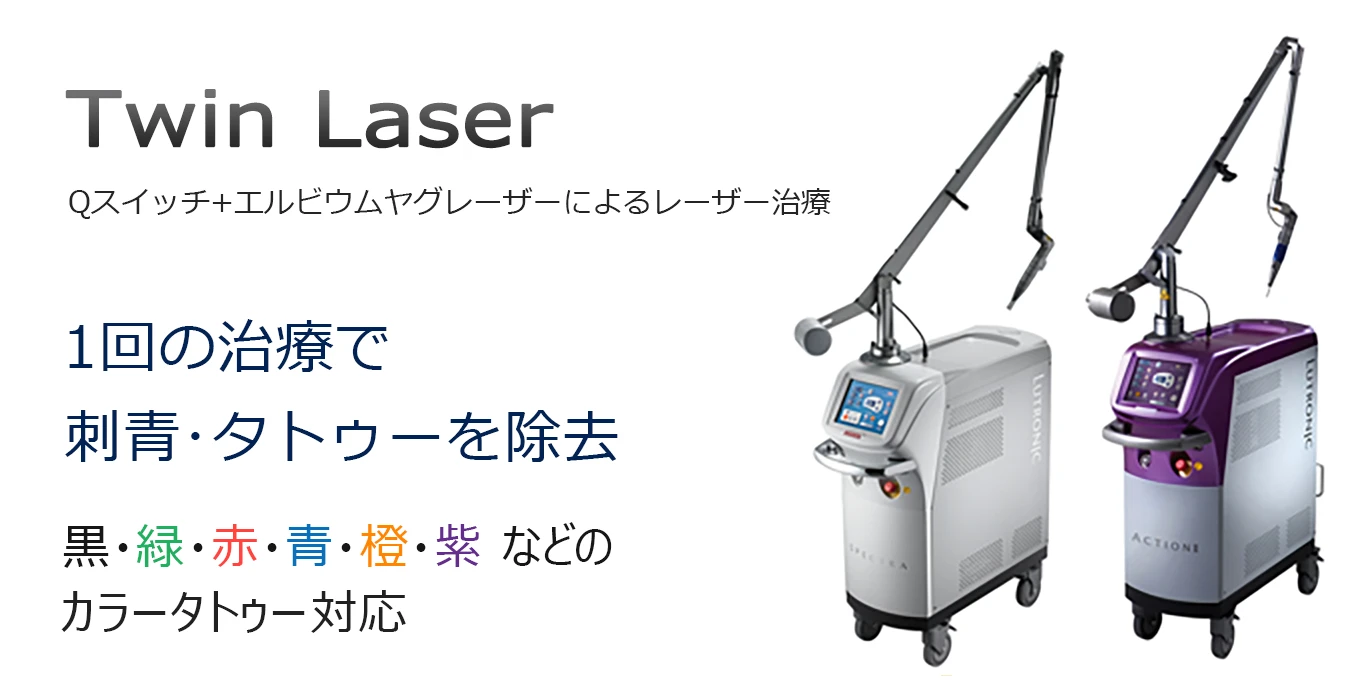 ツインレーザーによる刺青除去の治療は、エルビウムヤグレーザーとQスイッチヤグレーザーを組み合わせたコンビネーション治療です。刺青の大きさや色、部位に関係なく刺青除去がが可能です。