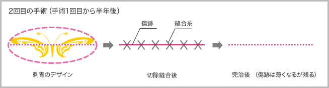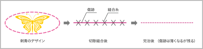 - 単純切除法は刺青の部位と大きさによりますが、1回で刺青や傷跡を除去する方法です。